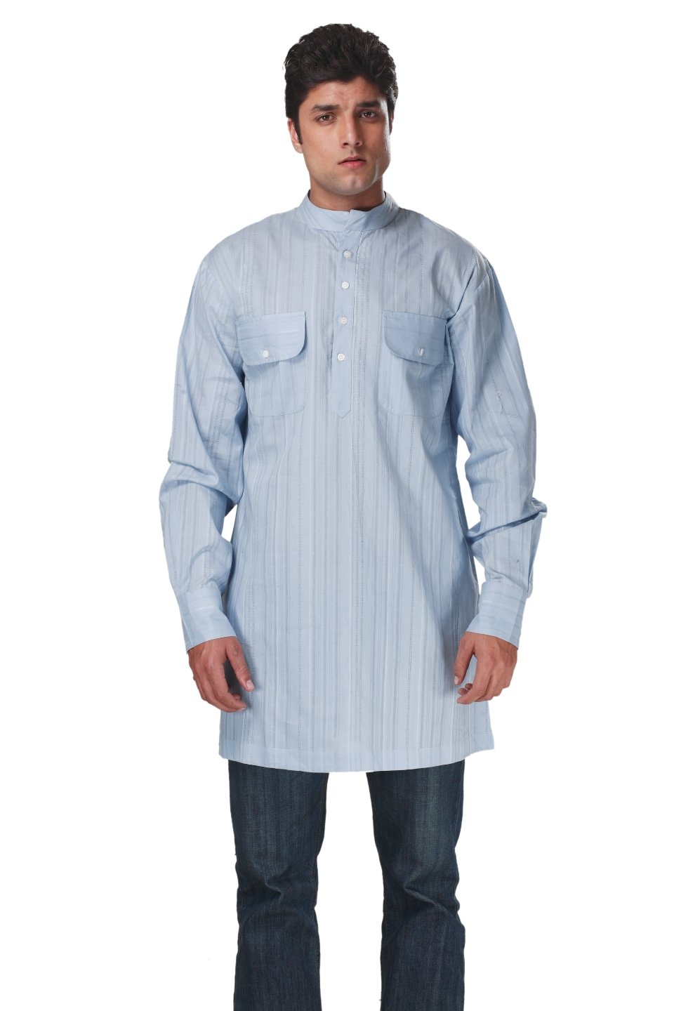 Light blue kurta with slight darker tone pin stripping, chest pockets, and partial button front to straight collar. ·Cotton-blend fabric (please allow 5% variance in color and/or embroidery) ·Machine wash cold with like colors, tumble dry no heat This product also comes in: Orange, Green, Grey, Navy, and White