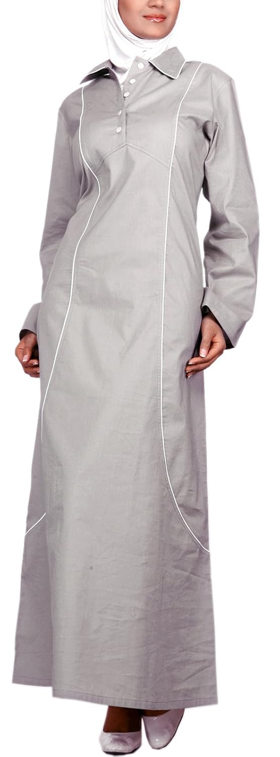Be it, at work or casual events, this grey twill Abaya fits every mood. You will stay warm in the cold weather and cool during those hot summer days. your monitor. ·100% heavy cotton fabric (please allow 5% variance in color and/or detail) ·White piping detail at collar and around princess seam ·Dry clean or machine wash cold with like colors, tumble dry no heat ·Dress shirt collar with button opening ·Note-Abaya is a light grey solid with white piping detail, color may appear light green on