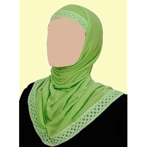 A light green 1 piece Al-Amira style hijab with crochet trim on the bottom edge and edge at forehead. This easy to wear hijab is minimum fuss with maximum results-- just pull it on over your head with the seam under your chin and you are ready to go, no pins or other fasteners! The crochet details on the forehead and bottom hems is 1" of stretchy material in an open checker-board pattern. This Al-Amira hijab is soft and durable, made from a breathable polyester that is washable.